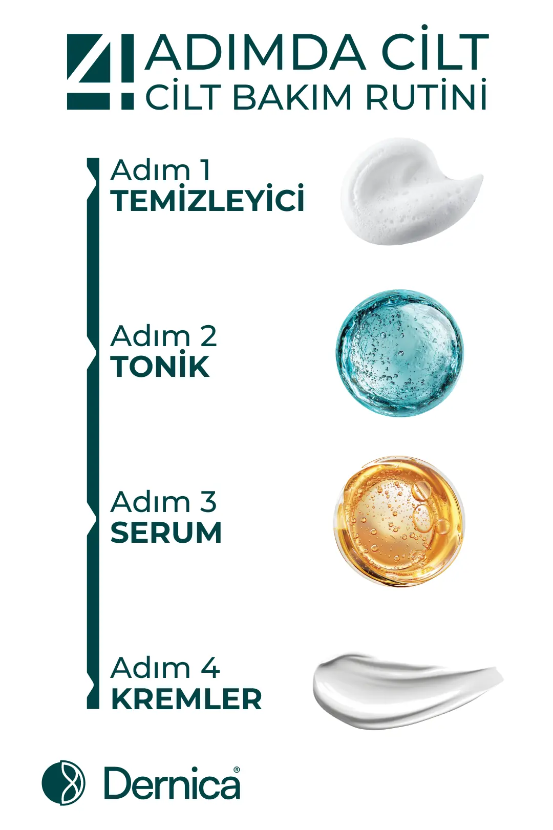 Sonuç olarak; doğru cilt bakım rutini; cildi yormadan ihtiyacına uygun ürünlerle ve düzenli olarak uygulandığında etkisini gösterir. Dernica Rice Extract Peeling Gel, Rose Tonic Spray & Pad, TXA3 Serum, HA3 Serum, Vita-C Serum, Collagen Serum ve Hydra Cream ile oluşturulan bir sabah ve akşam rutini, cildi arındırmaya, nemlendirmeye ve daha dengeli bir görünüm kazandırmaya yardımcı olur. Sağlıklı bir cilt için doğru adımlar, doğru içerikler ve sürdürülebilir bir bakım yaklaşımı yeterlidir.